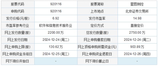 星图测控2024年12月20日披露的向不特定合格投资者公开发行股票并在北京证券交易所上市发行公告显示,若本次发行成功,超额配售选择权行使前,预计公司募集资金总额为19,030.00万元,扣除发行费用2,571.83万元(不含增值税)后,预计募集资金净额为16,458.17万元;若超额配售选择权全额行使,预计公司募集资金总额为21,884.50万元,扣除发行费用2,720.26万元(不含增值税)后,预计募集资金净额为19,164.24万元。