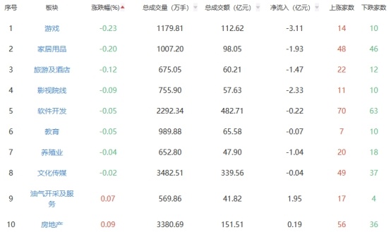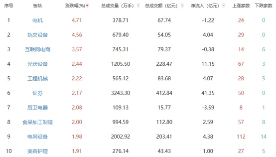行业板块方面,电机、轨交设备、互联网电商等板块涨幅居前,游戏、家居用品、旅游及酒店等板块跌幅居前。