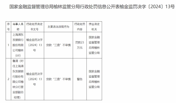 国家金融监督管理总局榆林监管分局对上海浦东发展银行股份有限公司榆林分行罚款23万元;对鲁清处以警告。