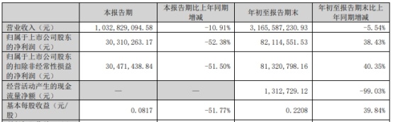 2024年前三季度,公司实现营业收入31.66亿元,同比下降5.54%;归属于上市公司股东的净利润8211.46万元,同比增长38.43%;归属于上市公司股东的扣除非经常性损益的净利润8132.08万元,同比增长40.35%;经营活动产生的现金流量净额131.27万元,同比下降99.03%。