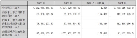 2023年,公司实现营业收入45.63亿元,同比增长1.31%;归属于上市公司股东的净利润1.01亿元,同比增长157.37%;归属于上市公司股东的扣除非经常性损益的净利润9885.12万元,同比增长166.84%;经营活动产生的现金流量净额1.97亿元,同比增长177.61%。
