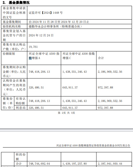 募集期间净认购金额2,186,969,552.56元,认购资金在募集期间产生的利息972,397.88元,募集份额合计2,187,941,950.44份。