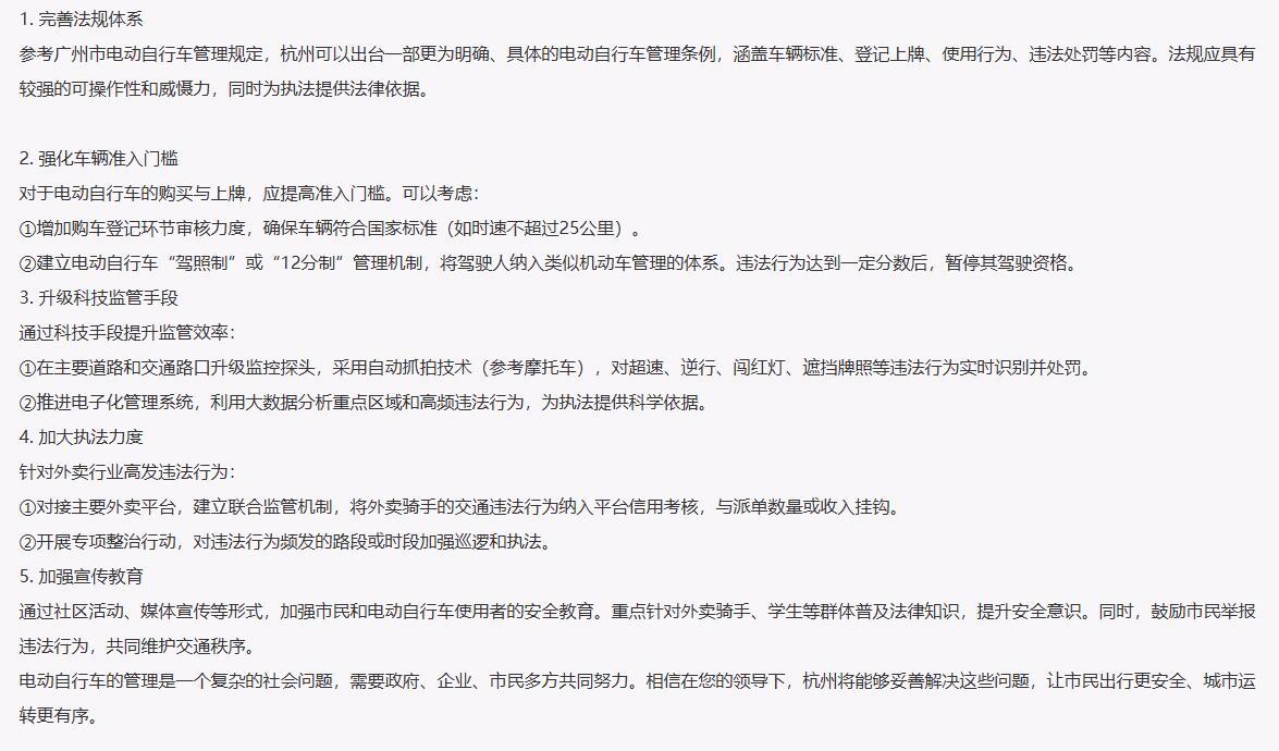 吴先生提出,为了更好地解决这些问题,建议从以下几个方面进一步加强管理:首先是完善法规体系方面,参考广州市电动自行车管理规定,杭州可以出台一部更为明确、具体的电动自行车管理条例,涵盖车辆标准、登记上牌、使用行为、违法处罚等内容。法规应具有较强的可操作性和威慑力,同时为执法提供法律依据。