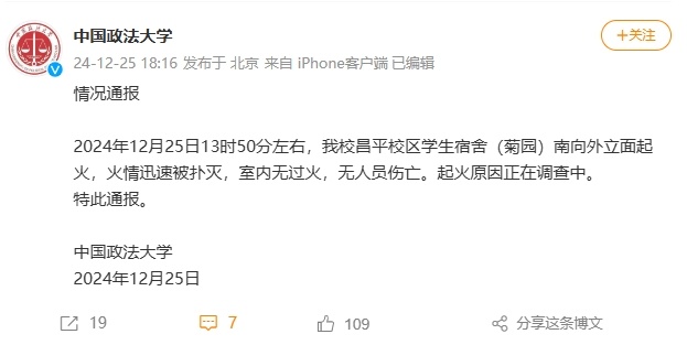 中新网12月25日电 据中国政法大学微博消息,2024年12月25日13时50分左右,中国政法大学昌平校区学生宿舍(菊园)南向外立面起火,火情迅速被扑灭,室内无过火,无人员伤亡。起火原因正在调查中。
