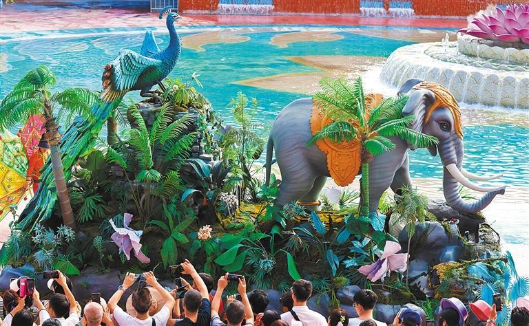 12月9日,位于景洪市勐罕镇的西双版纳傣族园景区内,以大象和孔雀形象衍生出的花车造型深受游客喜爱。