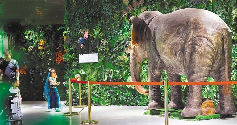 12月8日,位于景洪市大渡岗乡的亚洲象创意体验园内,工作人员向小朋友介绍景洪市的吉祥物之一“景景”,它的原型是一头憨态可掬的亚洲象。