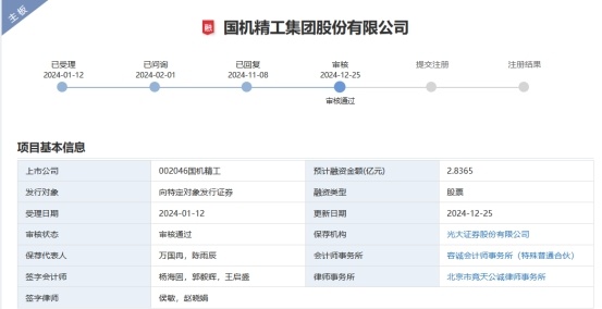 中国经济网北京12月26日讯 国机精工(002046.SZ)昨日晚间披露《关于申请向特定对象发行股票获得深圳证券交易所上市审核中心审核通过的公告》。