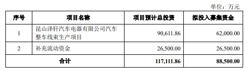 沪光股份8月17日披露的2024年度向特定对象发行股票预案(二次修订稿)显示,本次向特定对象发行股票募集资金总额预计不超过88,500.00万元(含本数),扣除发行费用后的募集资金净额将用于:昆山泽轩汽车电器有限公司汽车整车线束生产项目、补充流动资金。