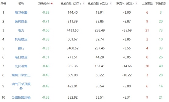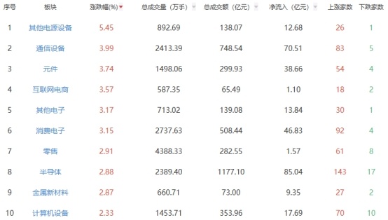 板块方面,其他电源设备、通信设备、元件等板块涨幅居前,厨卫电器、医药商业、电力等板块跌幅居前。