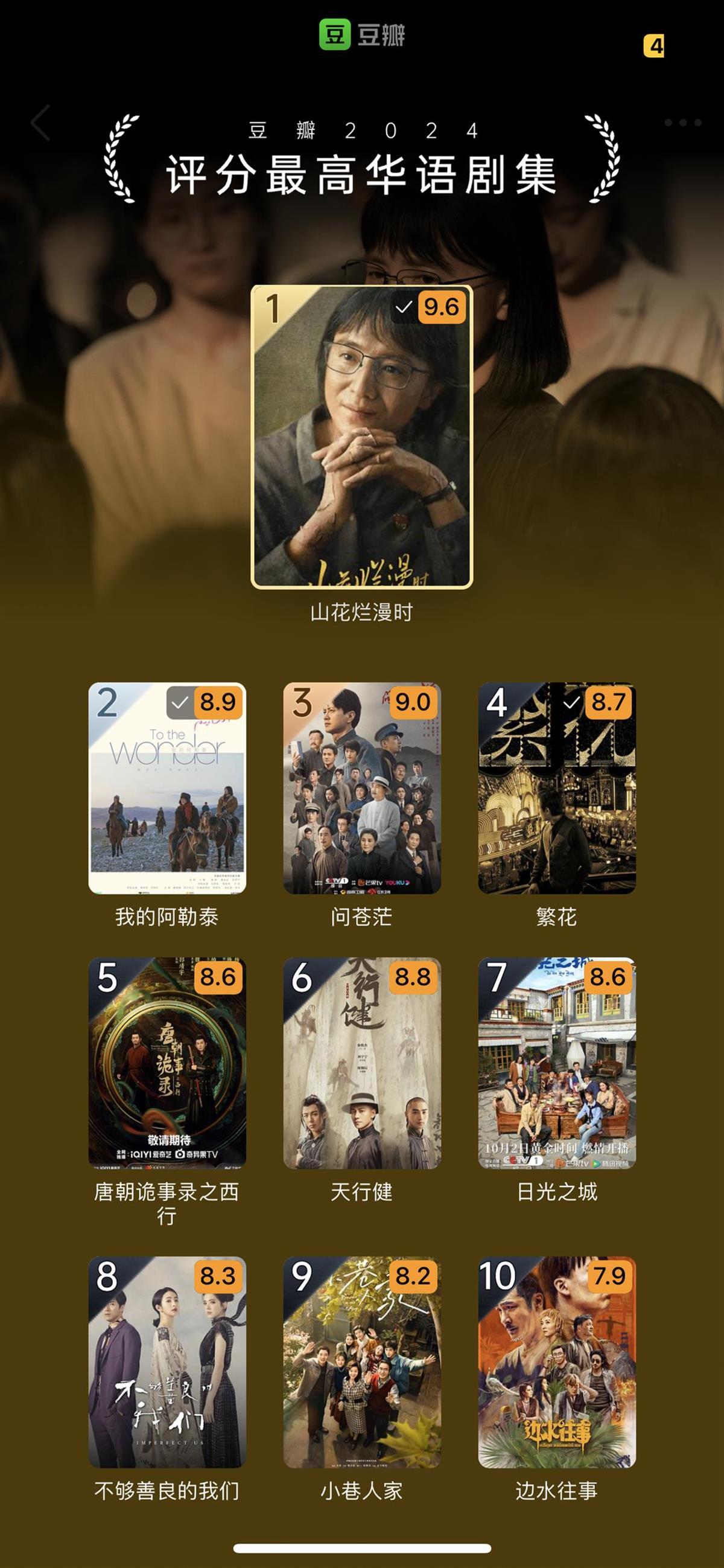 《山花烂漫时》之外,勾勒出新疆阿勒泰夏牧场美景以及诗意生活的《我的阿勒泰》凭借8.9分位居2024华语剧集榜单第二位,评分9.0的《问苍茫》排名第三,年初掀起观剧讨论热潮的《繁花》,则凭借8.7的评分,位列第四。