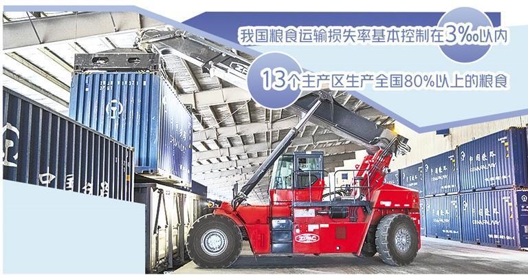 中储粮储运有限公司副总经理房巨松说,粮食从入仓到出仓全流程封闭作业,采用先进的抑尘降耗技术,能有效控制港口作业中转损耗。集装箱海铁联运可以大大减少粮食搬倒次数,运输损耗基本可控制在1‰以内。