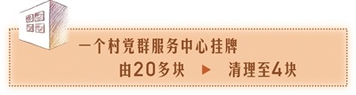 前几年,“牌子多”“制度杂”“任务不明确”等问题在村级组织的工作中十分突出。最多的时候,我们黄梅村党群服务中心里上墙制度有几十种,悬挂的牌子有20多块,涉及多个部门、行业,让人眼花缭乱。此外,像亲属关系证明、无犯罪记录证明等不应由村里开具的证明,村民们都会来开。
