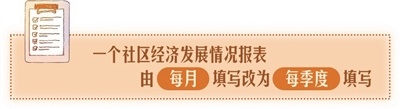 以前,每到季末、年末,社区干部都忙于各种考核、检查、汇报材料。今年,这一现象有了明显改观,报表数量大幅减少,填报频率也降低了很多。以前每月都要填写的社区经济发展情况考核报表,现在改为每季度填写一次,内容也更加简洁,只要求填写重点项目进展和主要经济指标变化等关键信息。