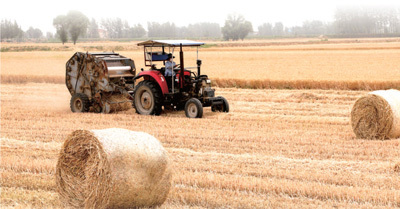 河南省卫辉市推广秸秆回收再利用。图为秸秆打捆机在田间作业。 李青春摄(人民视觉) |