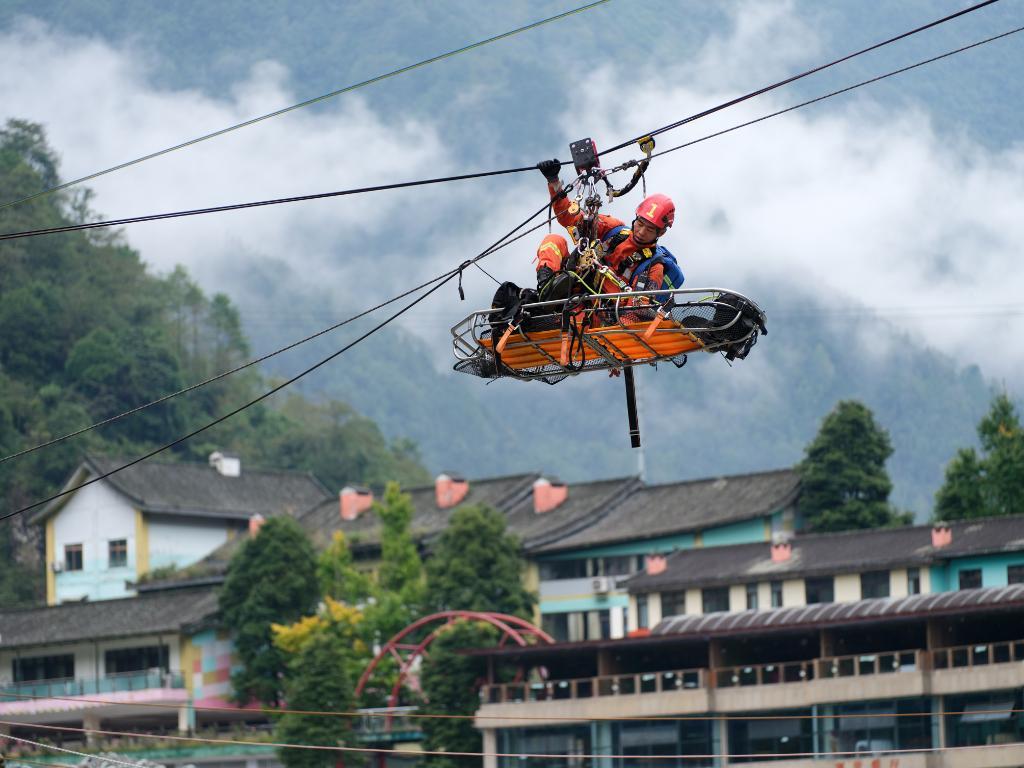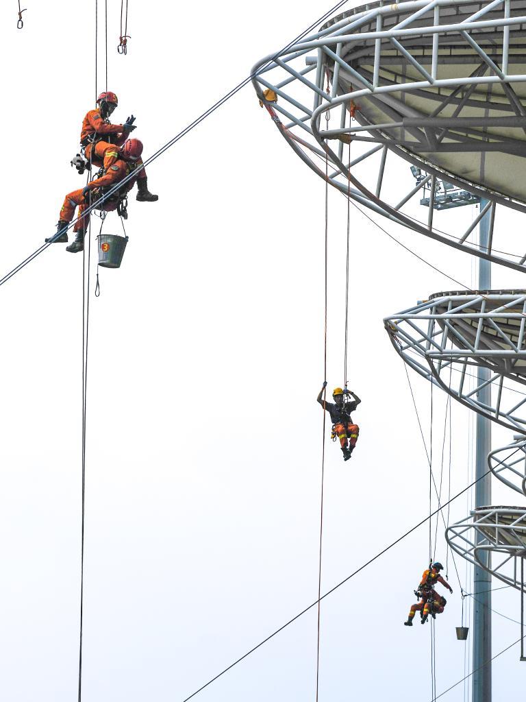 在成都举行的一场救援技术交流赛中,救援人员参加绳索救援技术比赛(10月15日摄)。