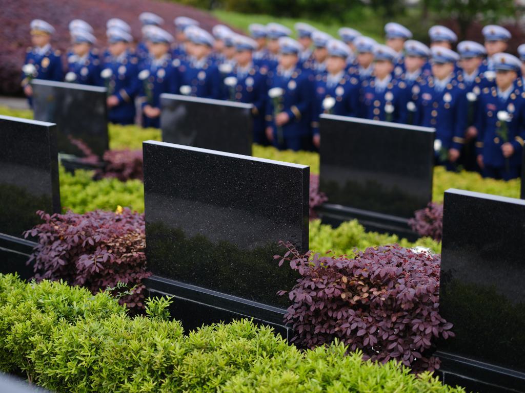 清明节前夕,四川省森林消防总队特勤大队在成都市烈士陵园缅怀长眠在这里的革命先烈和救火勇士(4月3日摄)。