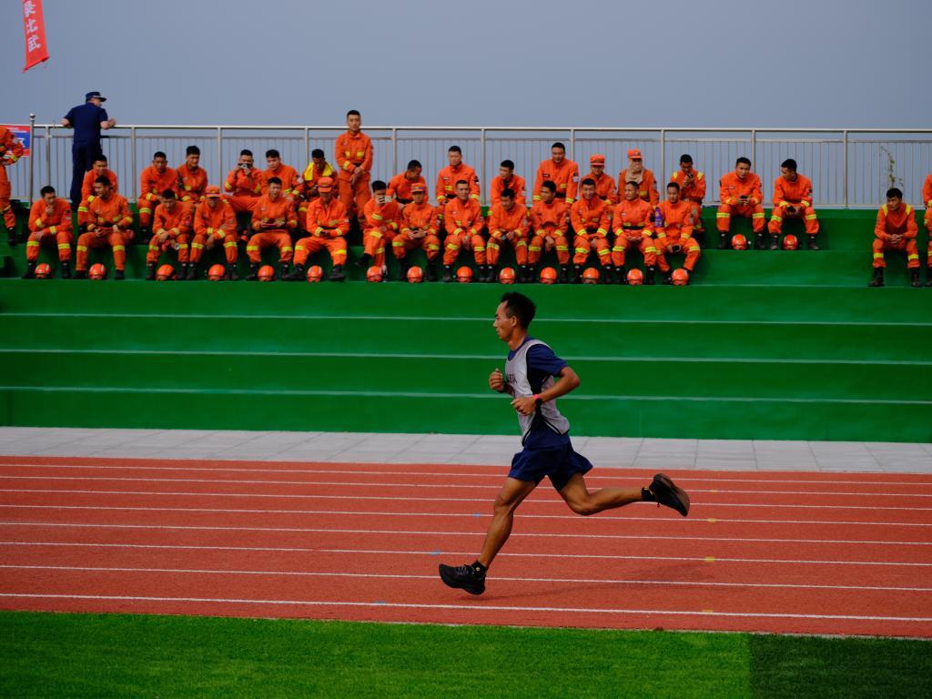 在四川省森林消防总队举行的“火焰蓝”训练尖子创破纪录比武中,一名消防员参加5000米比武竞赛(9月23日摄)。