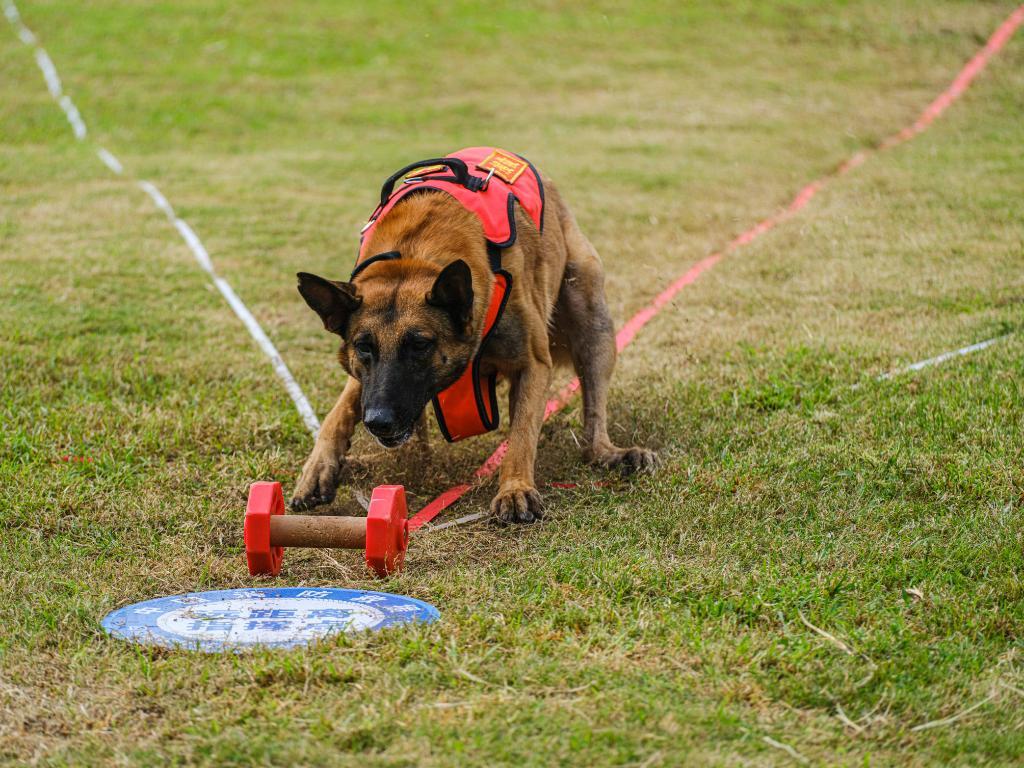 在四川省森林消防总队举行的搜救犬技术比武竞赛中,一只搜救犬在指挥服从比武中进行哑铃衔取竞赛(9月24日摄)。