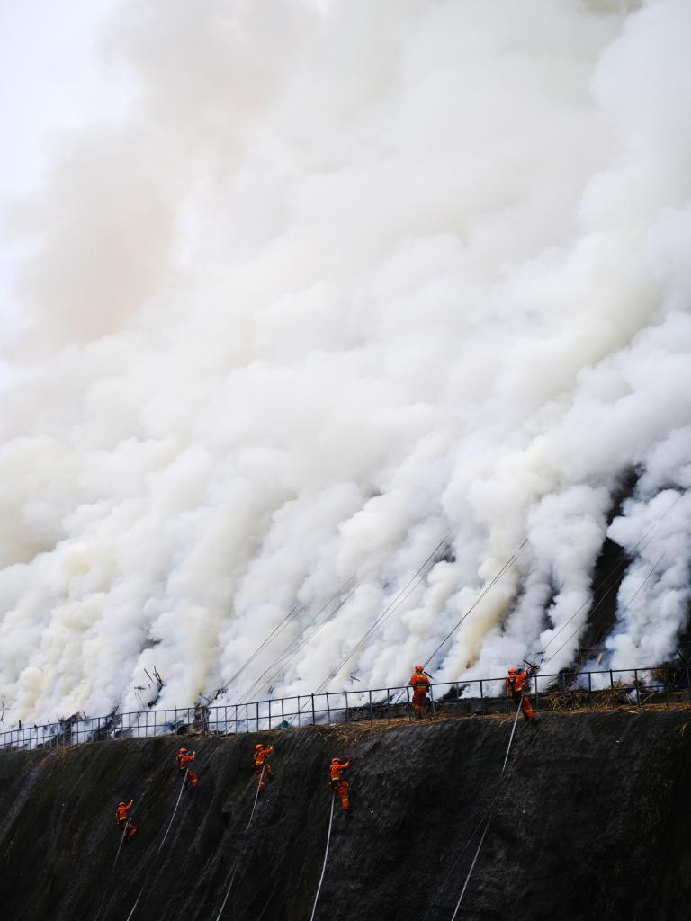 在四川省达州市宣汉县林区举行的川渝地区森林火灾联合应急演练中,四川省森林消防总队特勤大队消防员利用绳索系统攀登悬崖,架设水泵灭火(1月15日摄)。