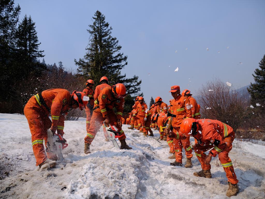 雅江县2号火场东北线,消防员在八角楼乡同达村为救援车辆破冰开路(3月17日摄)。