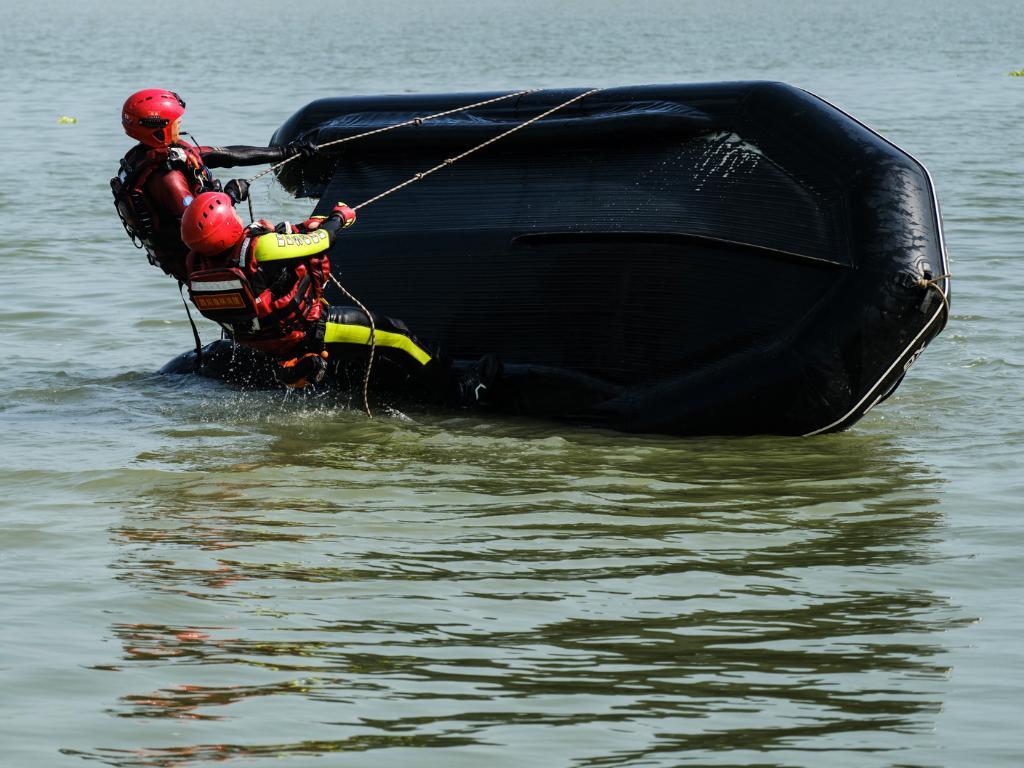 四川省森林消防总队特勤大队消防员在沱江金堂段进行水域救援训练(8月26日摄)。