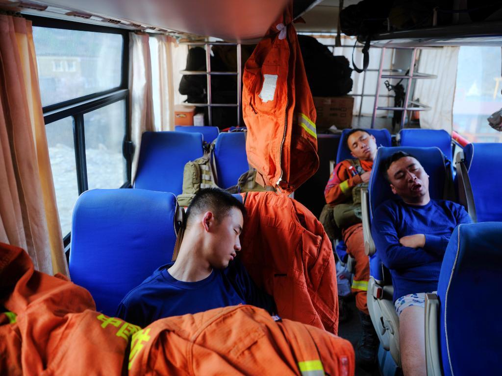 消防员唐阳(左)、刘瑞民(右前)、辛绍杨连夜扑救雅江2号火场南线东段后,回车上休息(3月24日摄)。