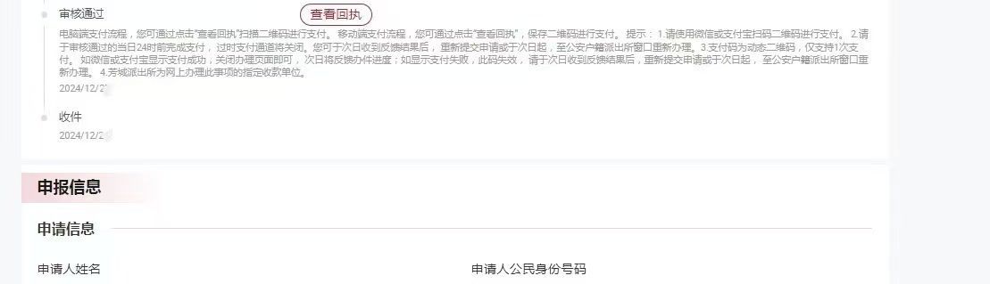 第二步:收到审核通过的短信提示后,使用电脑终端再次登录北京市政务服务网进入“个人空间--我的办件”,点击“查看回执”,使用微信或支付宝扫描二维码进行支付。支付成功后,等待公安机关制作证件。