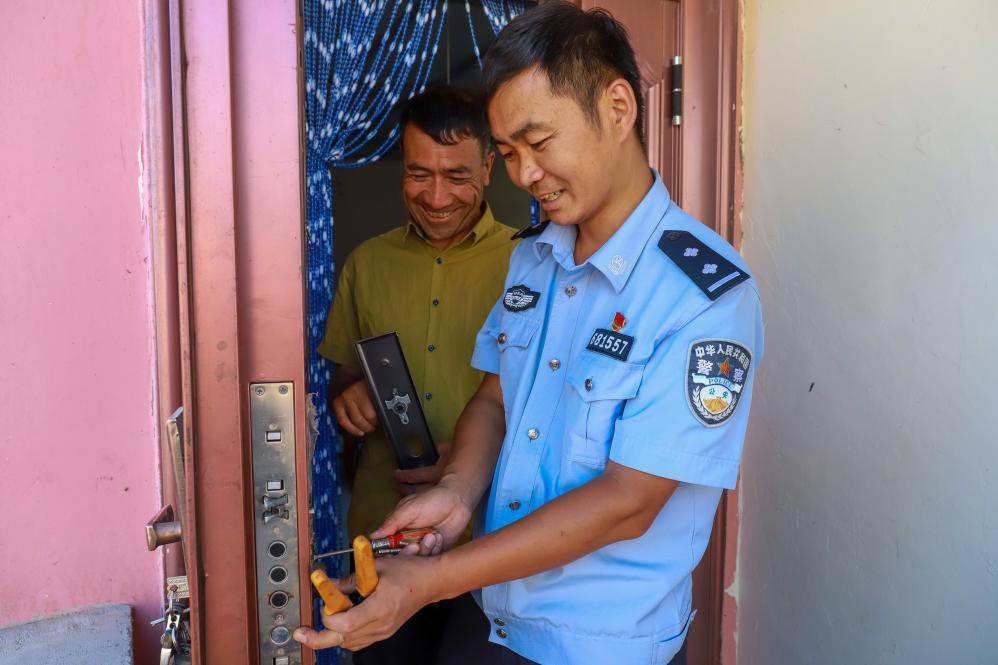 下马崖边境派出所民警何春明在为居民维修入户门。(受访者供图)