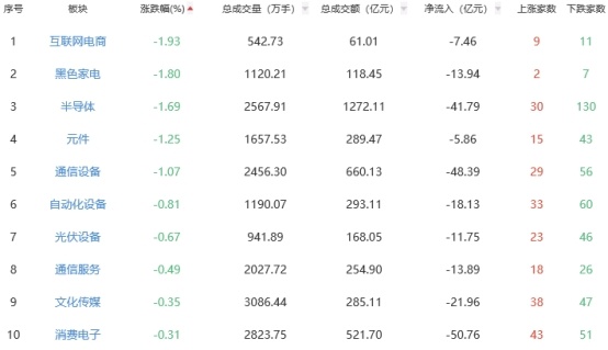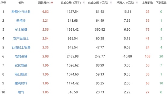 板块方面,种植业与林业、养殖业、军工装备等板块涨幅居前,互联网电商、黑色家电、半导体等板块跌幅居前。