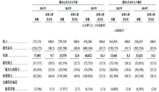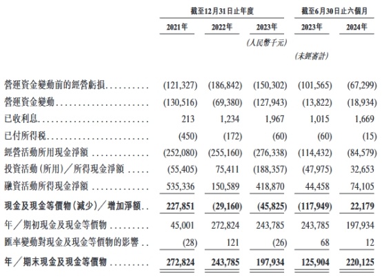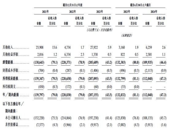 2021年、2022年及2023年12月31日止年度以及截至2024年6月30日止六个月,公司的收入分别为175.2百万元、279.4百万元、476.2百万元、236.7百万元;亏损净额分别为139.8百万元、220.8百万元、207.2百万元、112.0百万元,累计已亏损679.8百万元。