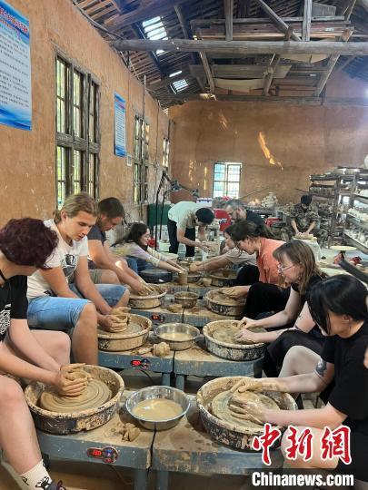 2024年10月,来自江西科技师范大学的外国留学生研学团到靖窑体验拉坯等陶瓷技艺。(受访者供图)