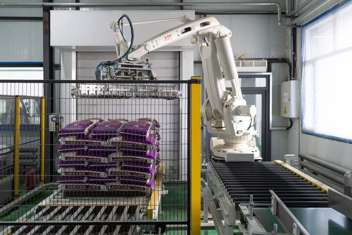 2024年3月29日,黑龙江省黑河市五大连池市一家农业科技企业的机械臂在车间内码放包装好的大豆种子。新华社记者 谢剑飞 摄