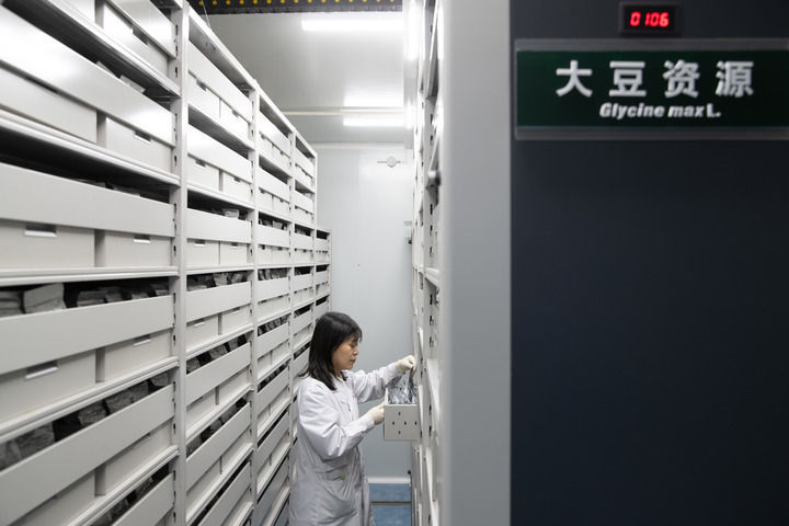 2024年4月2日,工作人员在国家寒带作物及大豆种质资源中期库(哈尔滨)查看大豆种质情况。新华社记者 张涛 摄