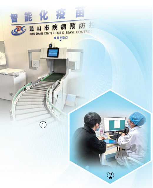 图①:江苏苏州市昆山市疾控中心智能化疫苗冷库实现全流程信息化。图为智能化疫苗冷库的存取口。 图②:浙江温州市第六人民医院结核预防门诊诊室内,医生给结核病密切接触者进行预防性治疗。 以上图片均为本报记者申少铁摄 |