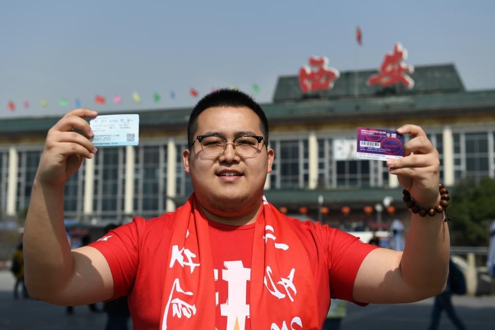 2019年3月16日,陕西大秦之水队球迷丁琪洲在西安火车站展示球票和球迷专列的车票。新华社记者 李一博 摄