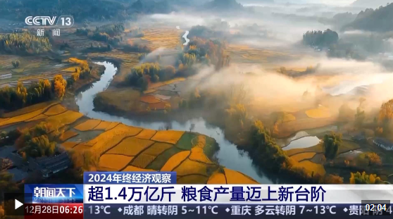 14130亿斤,这是2024年我国粮食总产量,比上年增加222亿斤,连续10年稳定在13000亿斤以上,首次突破14000亿斤,创历史新高。