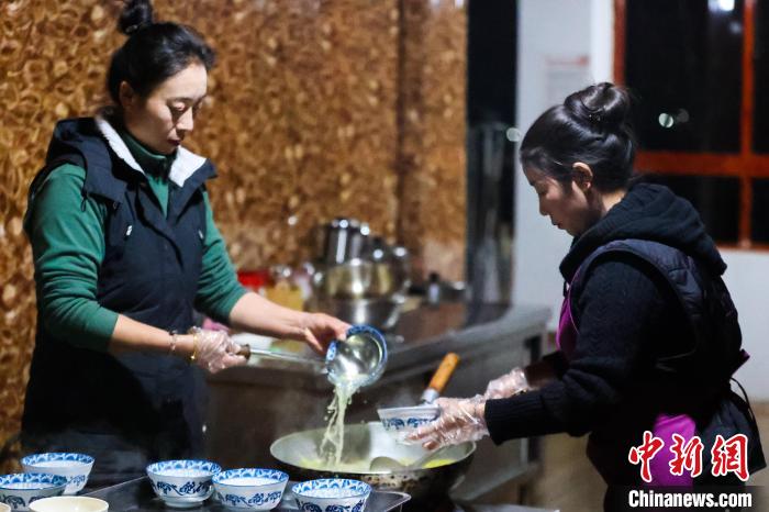 12月20日,西藏芒康,果拉卓玛(左)在为食客盛加加面。中新社记者 薛蒂 摄