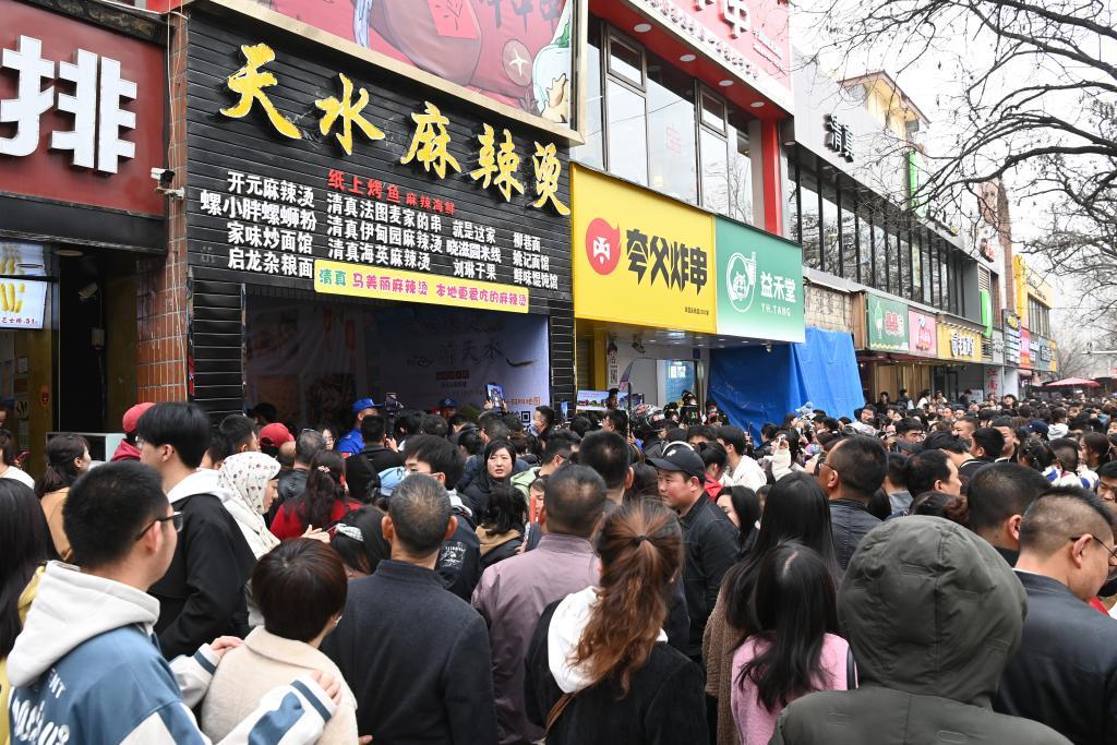 3月16日,在天水市秦州区的天水名优小吃城,游客排队等待品尝麻辣烫。(新华社记者 范培珅 摄)
