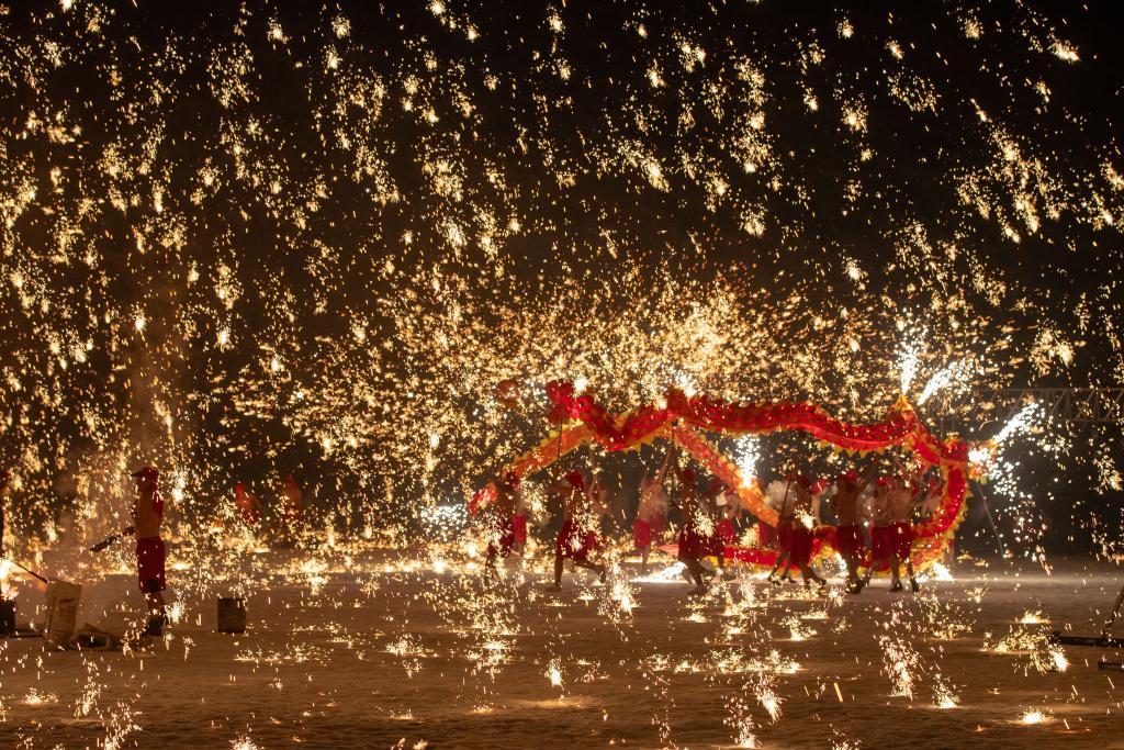 1月29日,在哈尔滨伏尔加庄园,铜梁火龙队的队员表演铜梁龙舞。(新华社记者 张涛 摄)