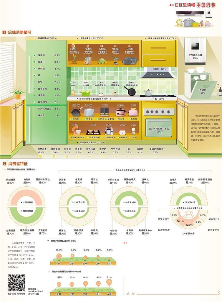 消费者对厨房产品的功能需求也日益多样化,打蛋工具、多功能刀等厨具产品销量增长均超2倍。嵌入式微蒸烤一体机、洗碗机等厨房电器产品持续热销,展现出消费者在追求厨房功能多样性的同时,更加注重节省空间与高效利用。