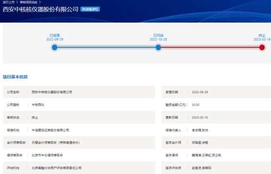 中核西仪曾拟在科创板上市,拟募资20亿元,但于2023年3月16日终止IPO事项。