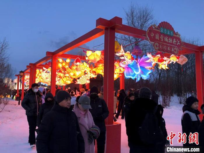 第二十四届中国·牡丹江雪堡乐园开园,游客在园区观赏彩灯。 牡丹江市委新闻中心供图