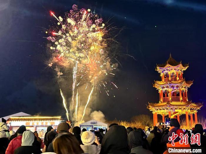 第二十四届中国·牡丹江雪堡乐园开园,游客在现场观赏绚烂的烟花。 牡丹江市委新闻中心供图