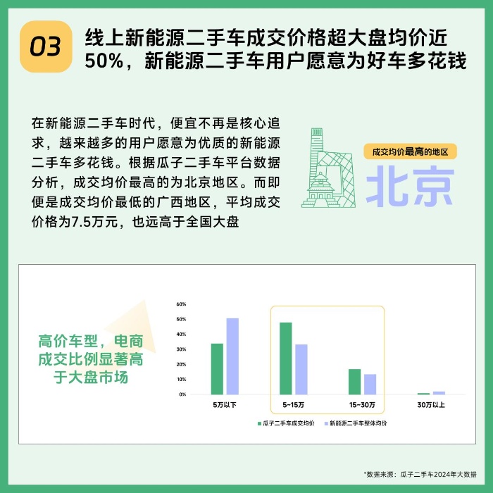 在具体价格段上,通过电商平台购车人群也更偏向于价格略高、但质量更好的车源。根据中国汽车流通协会《2024年10月全国二手车市场深度分析》的数据,当前新能源二手车成交车型中,5万元以内占比一半,其中绝大部分集中在3万以下。而瓜子平台上,近7成新能源二手车成交价在5万元以上,5-30万车型成交比例高于整体市场。