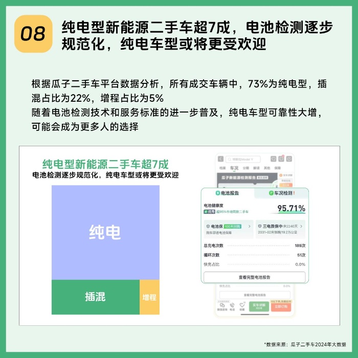 8.纯电型新能源二手车超7成,电池检测逐步规范化,纯电车型或将更受欢迎