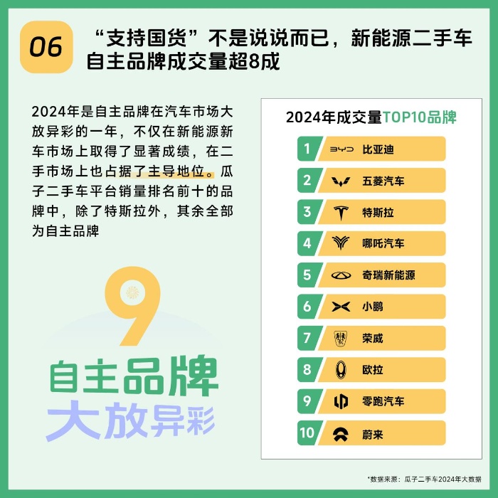 2024年是自主品牌在汽车市场大放异彩的一年,不仅在新能源新车市场上取得了显著成绩,在二手市场上也占据了主导地位。通过瓜子二手车电商平台成交的新能源二手车中,84%的成交车辆为自主品牌,美国品牌仅占9%,其中特斯拉几乎占据了美国品牌的全部份额。在销量排名前十的品牌中,除了特斯拉外,其余全部为自主品牌。