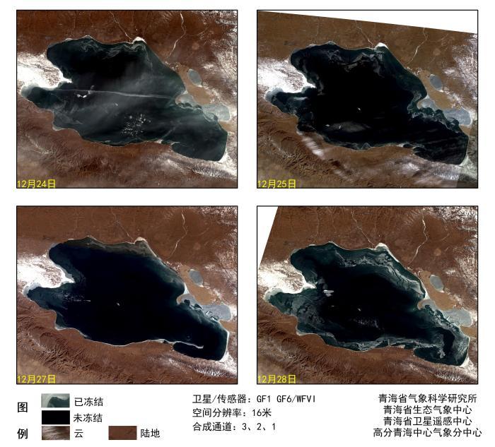 图为12月24日至28日青海湖湖冰冻结遥感监测情况。 青海省气象科研所 供图