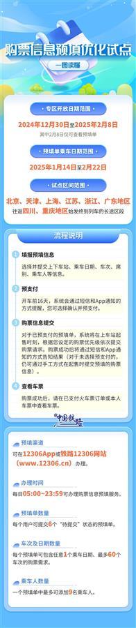 据介绍,2024年12月30日至2025年2月8日间,铁路部门在北京市、天津市、上海市、江苏省、浙江省、广东省各车站往返四川省、重庆市各车站始发终到列车的长途区段车票发售中,试点推出“系统自动提交购票订单”功能。