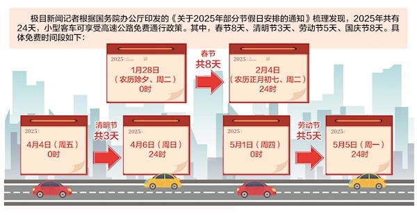 极目新闻记者根据国务院办公厅印发的《关于2025年部分节假日安排的通知》梳理发现,2025年共有24天,小型客车可享受高速公路免费通行政策。其中,春节8天、清明节3天、劳动节5天、国庆节8天。