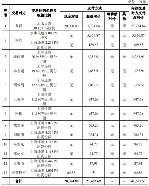 本次交易中,水木天蓬37.1077%股权的最终交易价格为33,091.51万元,上海还瞻100%出资份额的最终交易价格为8,476.06万元。按照本次发行股票价格13.10元/股计算,本次交易购买资产的股份发行数量为16,398,994股。